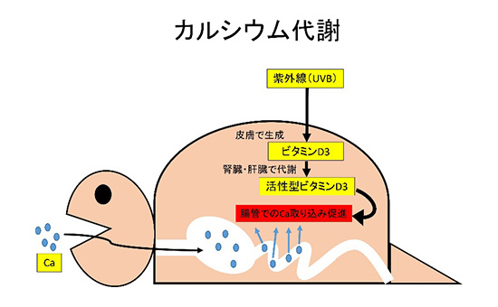 自然下における昼行性爬虫類は日光に含まれる紫外線(UVB)を浴びることによって皮膚でビタミンD3が生成されます。ビタミンD3は肝臓および腎臓で代謝され活性型ビタミンD3となり、腸管からのカルシウム吸収や腎臓でのカルシウムの再吸収を促します。食餌中のビタミンD3は紫外線照射によって皮膚で生成されたものと比較して、生体内での利用効率は低いとの報告があります。