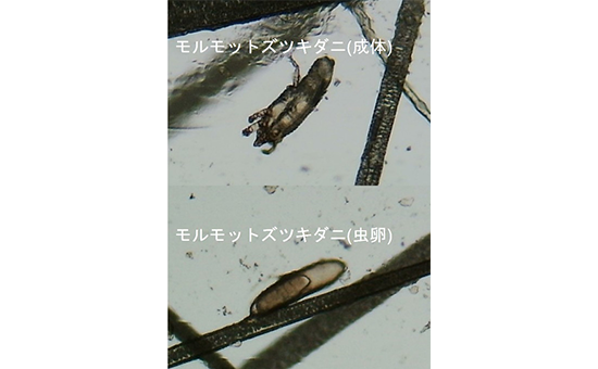モルモットズツキダニは別名モルモット被毛ダニとも呼ばれ、被毛につかまるようにして寄生し、虫卵も被毛に産み付けられます。吸血性はありませんが、皮膚の組織液などを吸って生活しています。