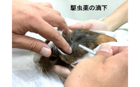 治療は必要に応じて2~4週間ごとに、背中の皮膚に駆虫薬を滴下します。多頭飼育している場合、別ケージで飼育しているモルモットでも汚染された環境から感染する可能性があるため、同時に治療を行います。一般的に滴下タイプの駆虫薬は皮膚から吸収され血液にのって全身に広がります。被毛には血管がないため、皮膚寄生のダニと異なり薬が届きにくく、症例によっては治療期間が長くなる事があります。